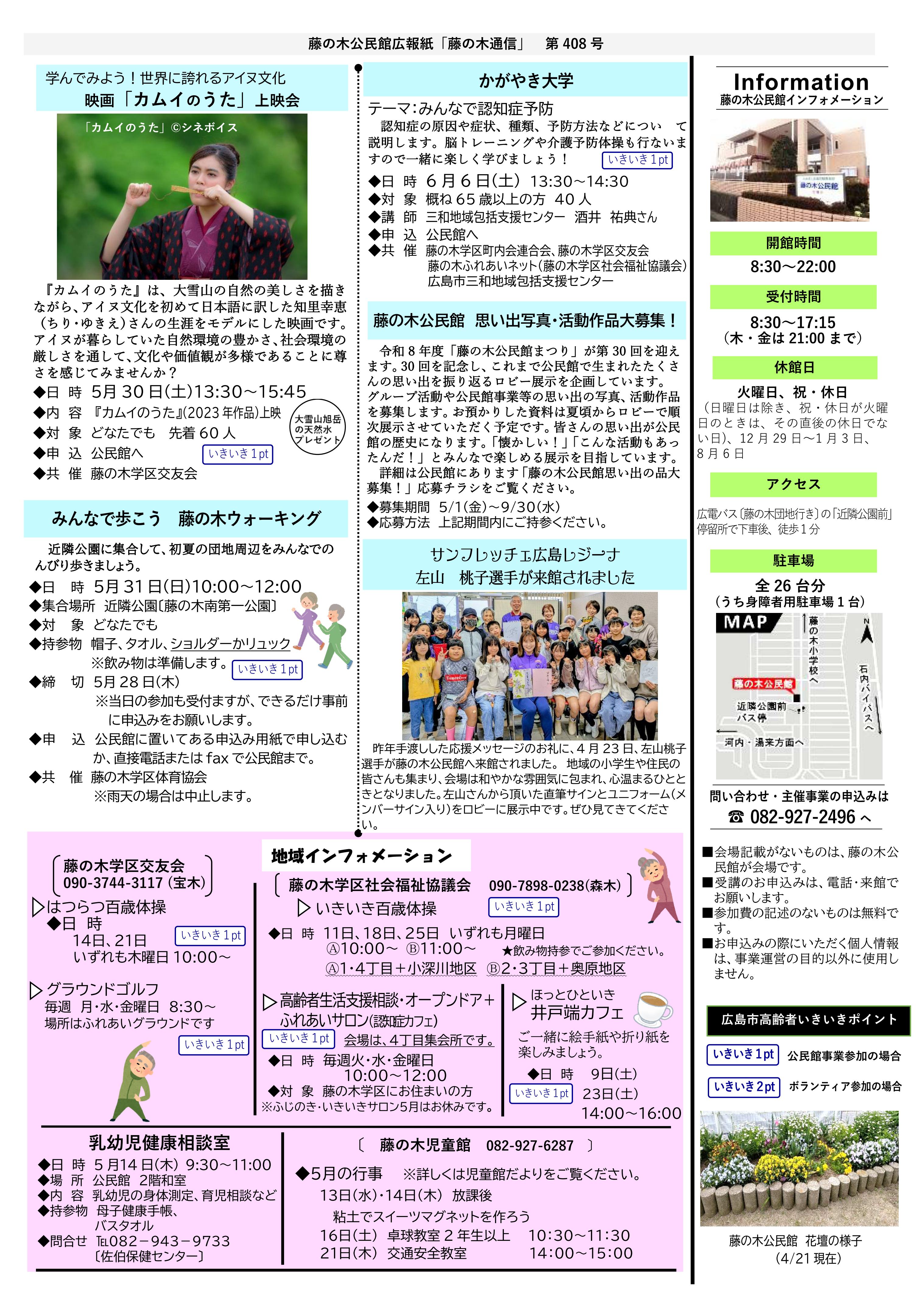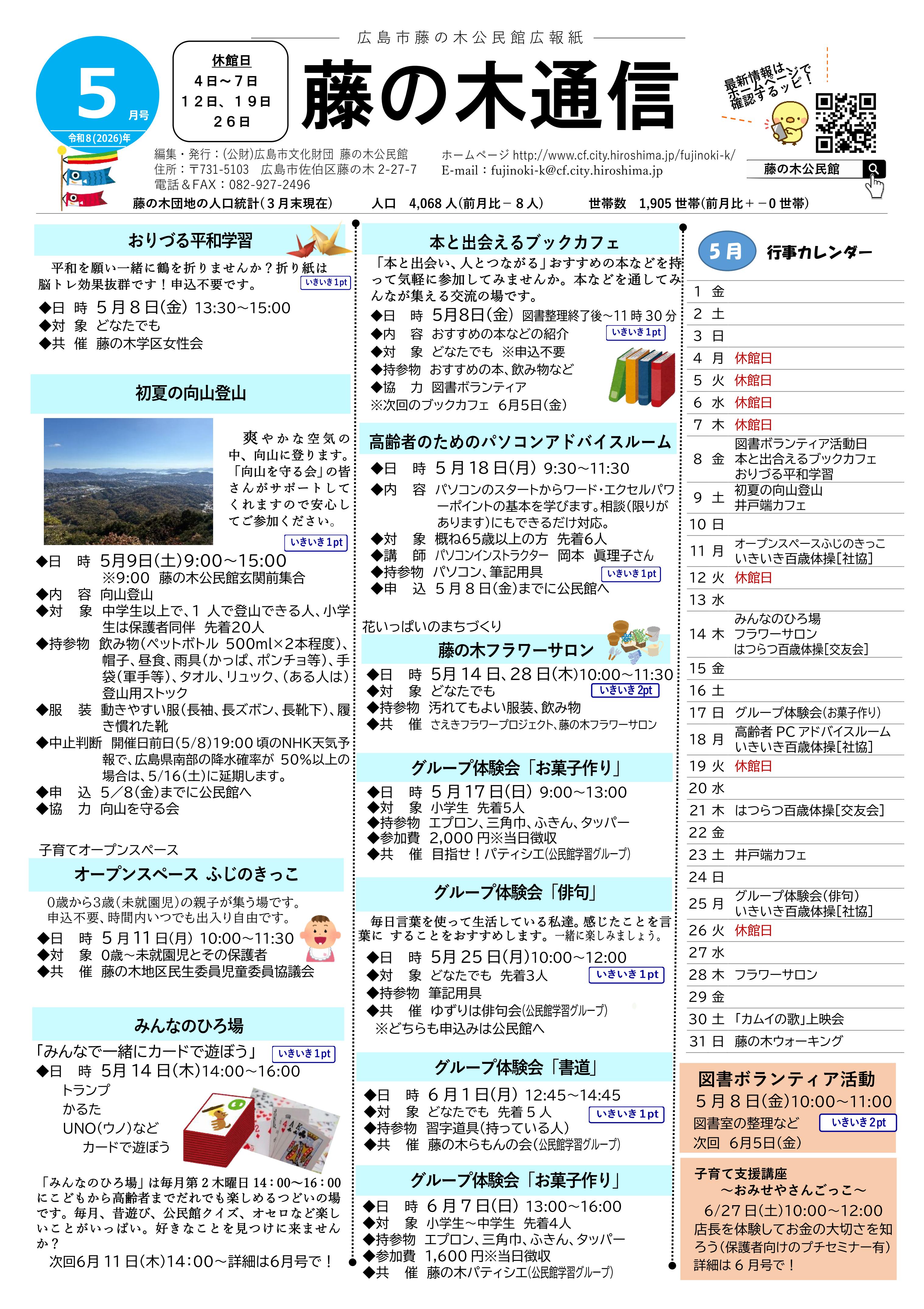 写真左は藤の木団地近くに聳える「向山(高山)」です。標高665.9mのこの山は自然豊かで植物観察も楽しめます。山頂付近では、広島市が一望でき、天気に恵まれたら四国山脈も望めます。地元の人にとても愛されている山です。