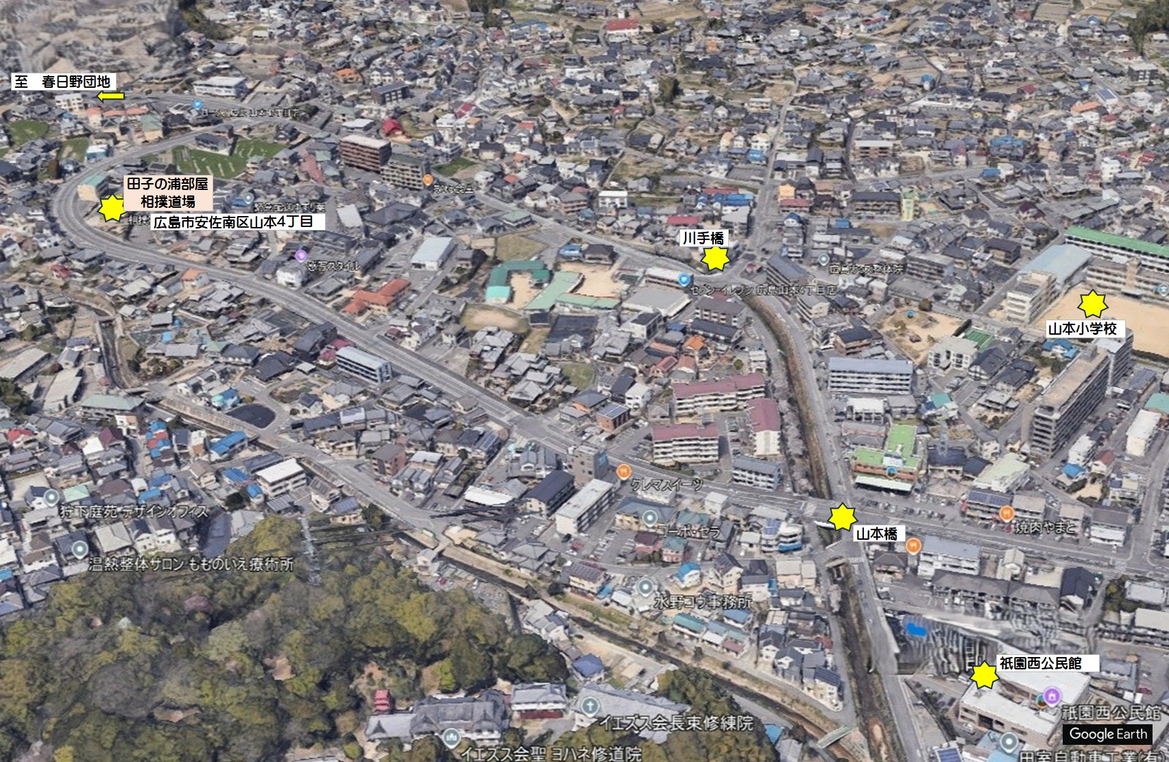 稽古は今年以降、毎年12月に 1〜2週間 程度行われる予定だそうです(中国新聞記事)。 道場の設置場所は、下の地図をご参照ください。