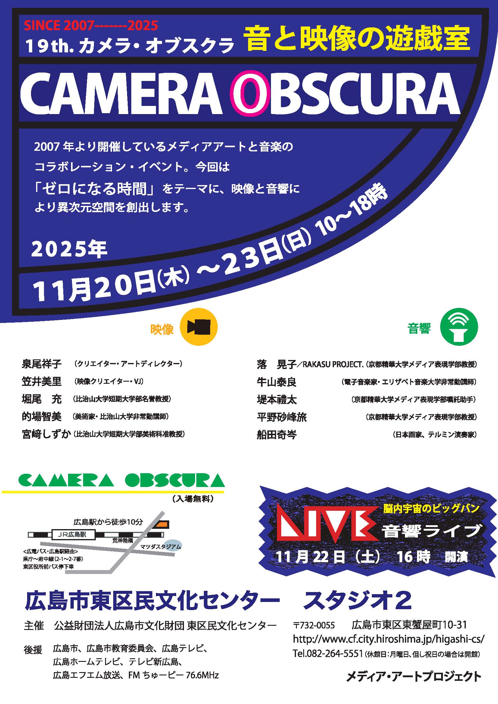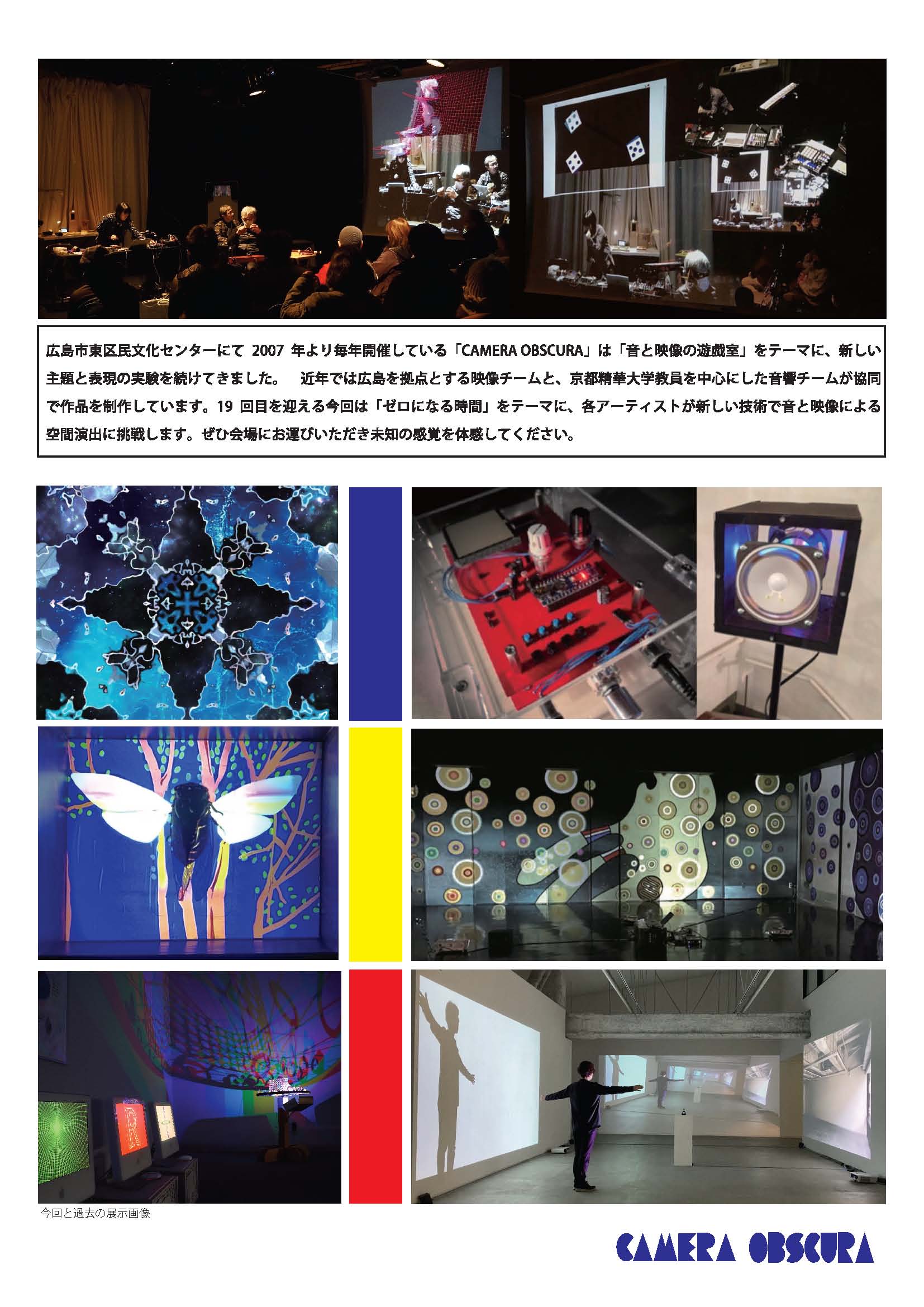 「CAMERA OBSCURA」は「音と映像の遊戯室」をテーマに、新しい主題と表現の実験を続けてきました。近年では、広島を拠点とする映像チームと、京都精華大学教員を中心にした音響チームが協同で作品を制作しています。19回目を迎える今回は「ゼロになる時間」をテーマに、各アーティストが新しい技術で音と映像による空間演出に挑戦します。ぜひ会場にお運びいただき未知の感覚を体感してください。
