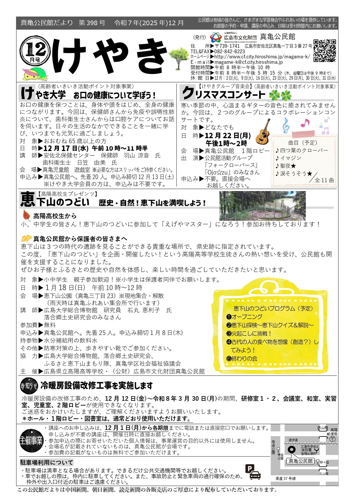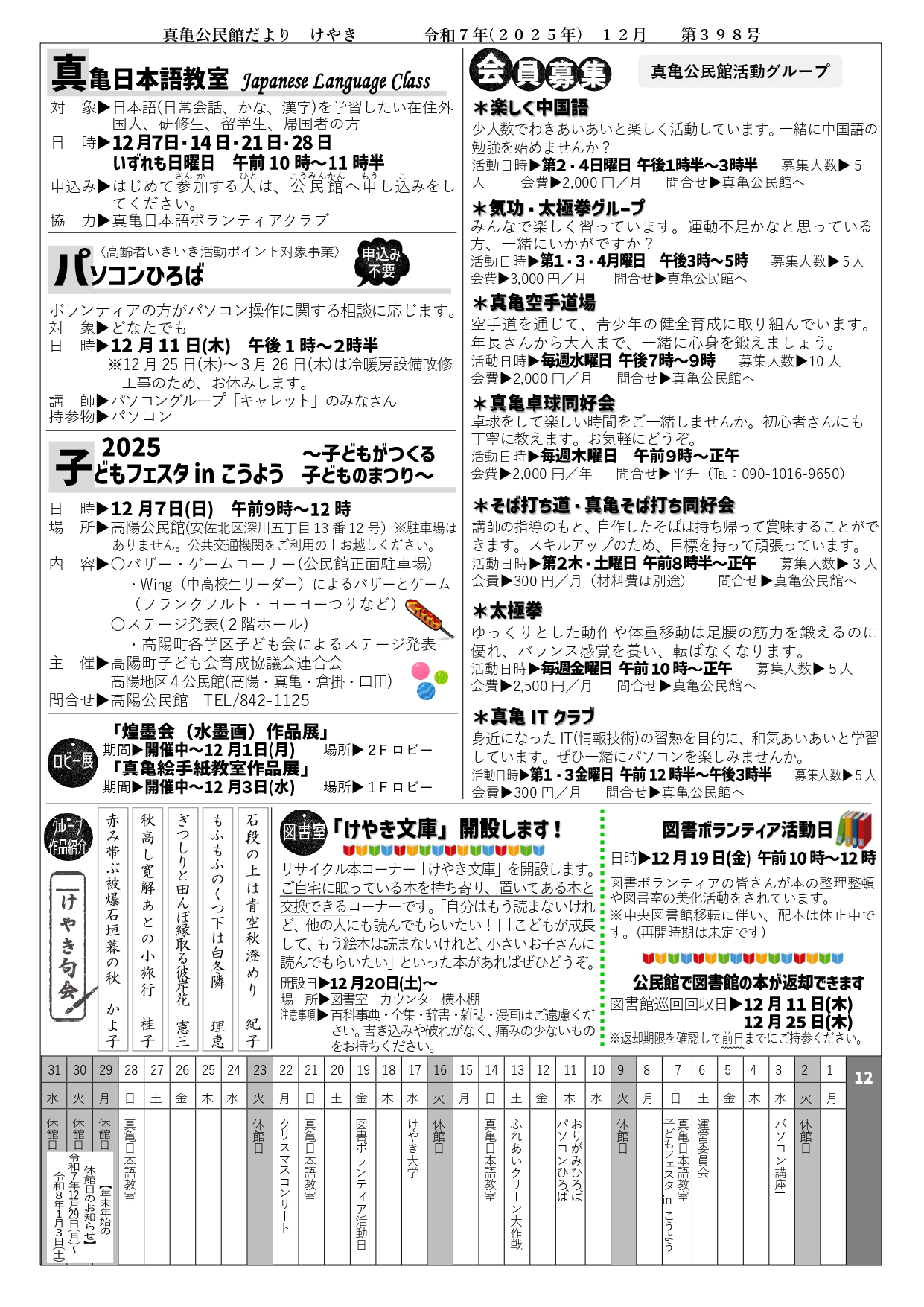 講座へのお申し込みは、12月1日(月)8時30分~各期限までに電話または直接窓口でお願いします。申し込みが不要の講座は、開催日時に直接お越しください。