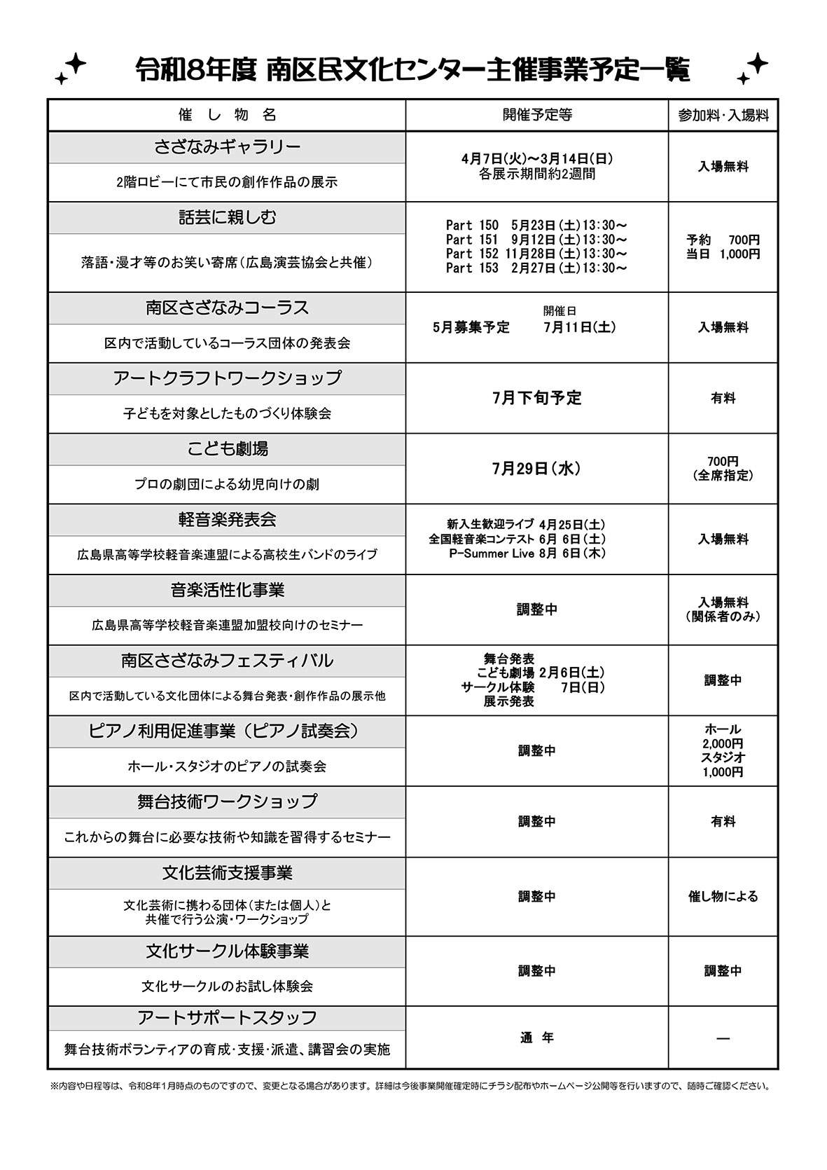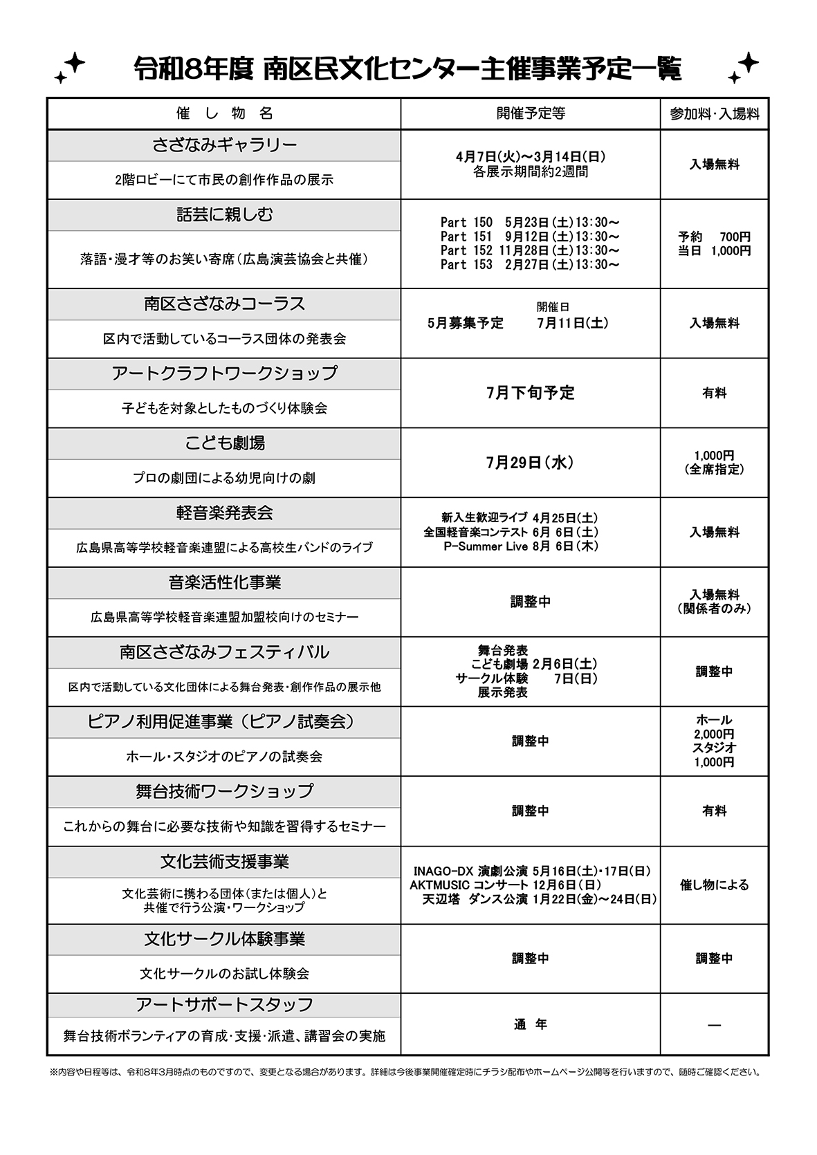令和8年度主催事業予定(令和8年3月時点)