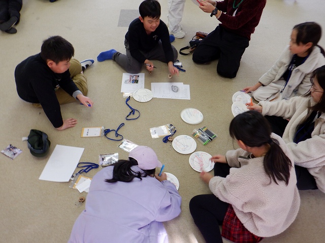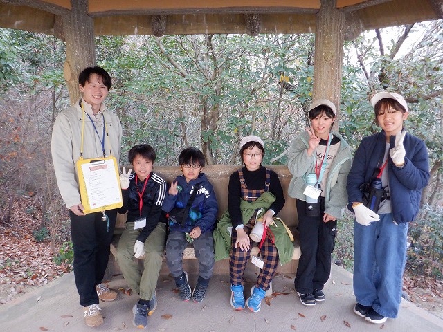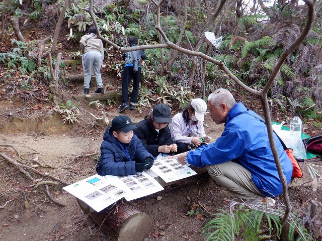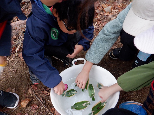 その後、班ごとに「自然散策」を行いました。「自然散策」では、①赤い実を拾ってくる、②においのある葉っぱを拾ってくる、③ドングリを拾ってくる、④みんなでササ船を作る、⑤写真の中からウグイスを当てる、などの10個の問題を解きながらオリエンテーリングを行い、三滝の冬を感じ取ることができました。