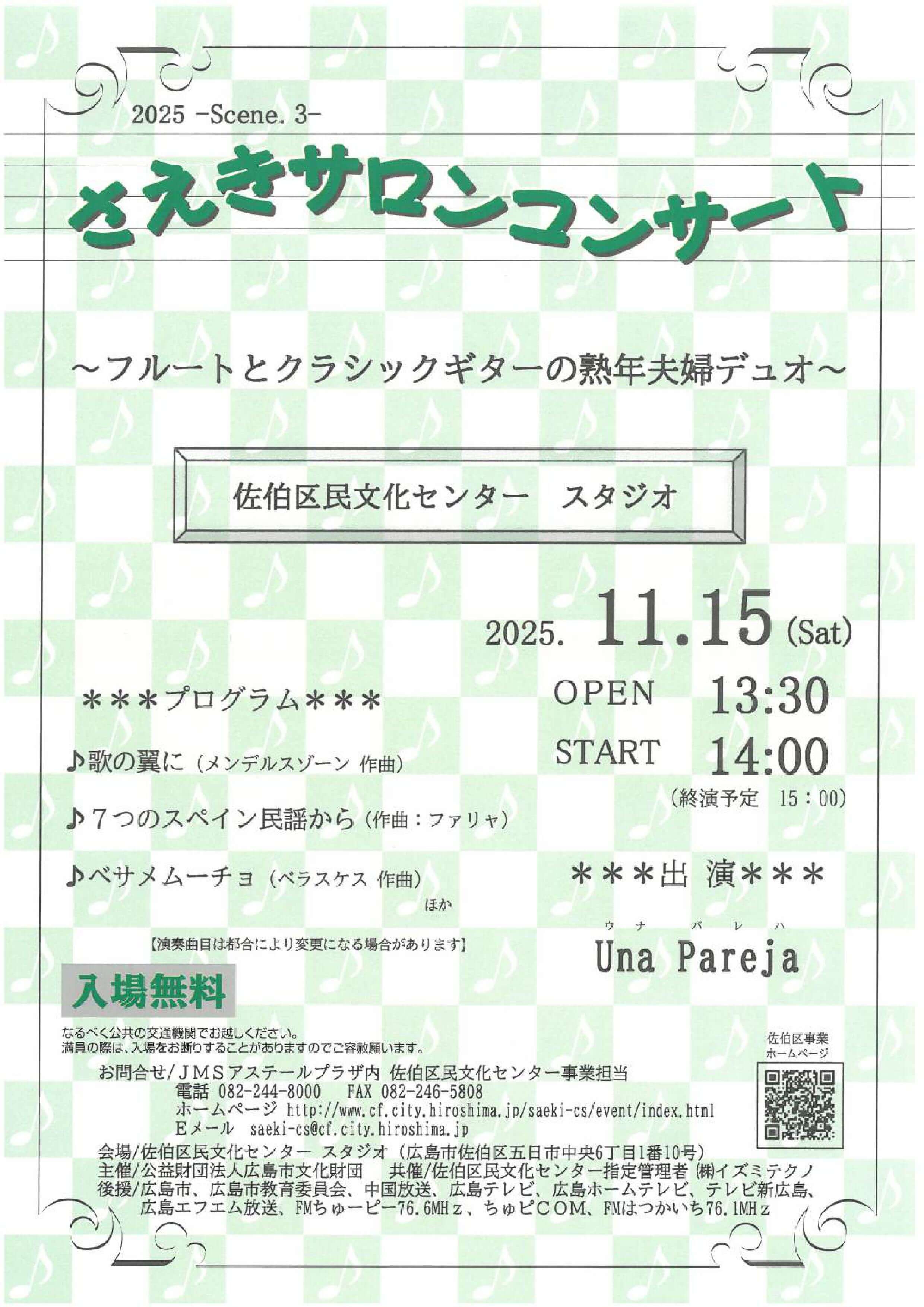 気軽に音楽を楽しんでいただく「さえきサロンコンサート」。佐伯区民文化センター活用事業としてリニューアルした令和7年度第3回目は「Una Pareja」(ウナ・パレハ)が登場します!