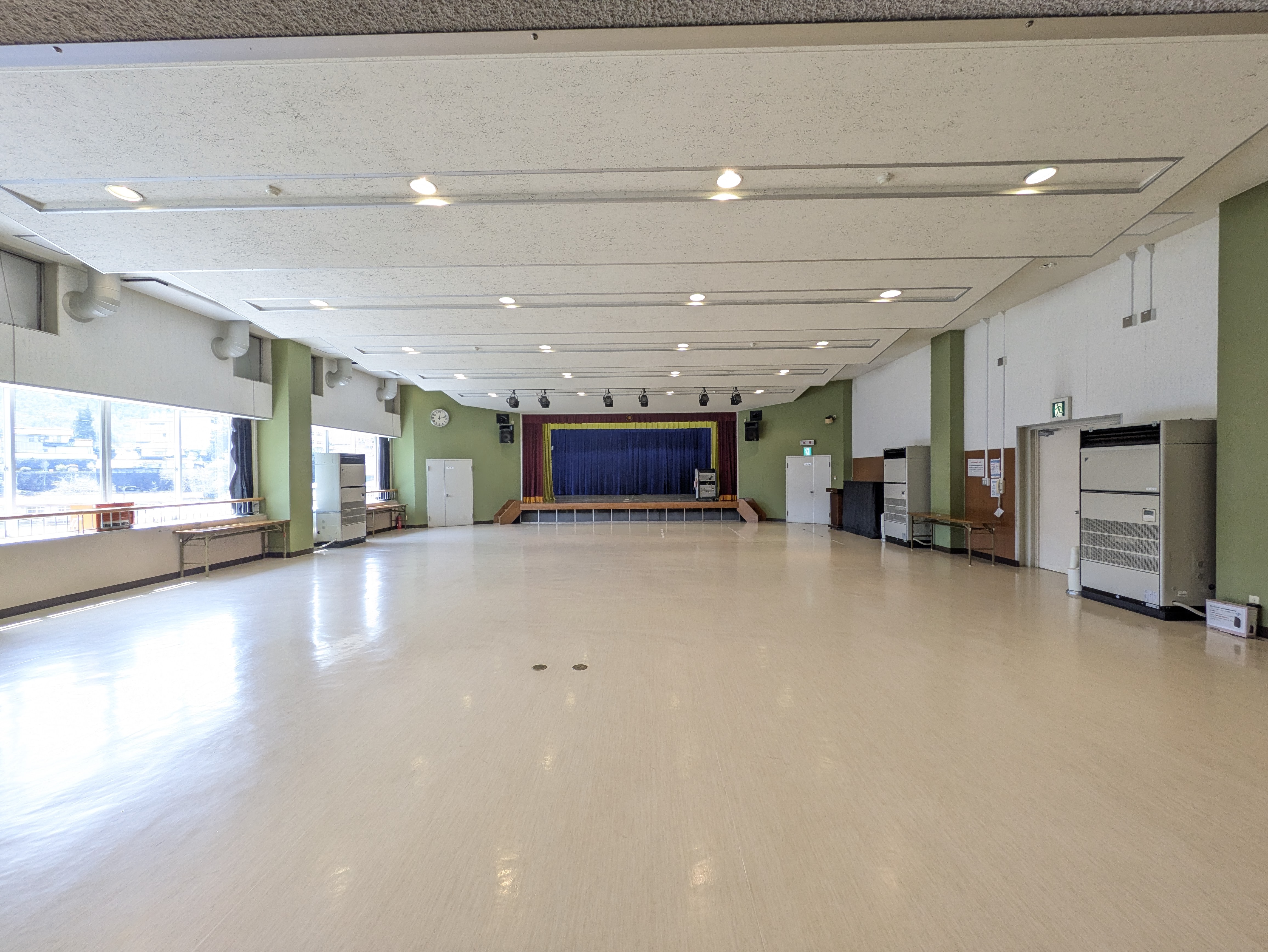 卓球台6台、舞台、音響設備、長机、椅子、スクリーン、アップライトピアノ、姿見ミラー |